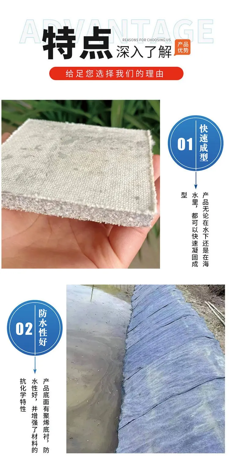根據(jù)工程需要進行定制,尺寸裁剪靈活,能夠適應(yīng)不同地形和尺寸的魚塘河道等工程。其次,水泥毯的施工過程簡單快捷,只需將其鋪設(shè)在預(yù)定位置,然后進行適當(dāng)?shù)墓潭ê宛B(yǎng)護,即可在短時間內(nèi)實現(xiàn)快速成型。這種施工方式不僅大大縮短了工期,還減少了人工成本和材料浪費。其抗壓強度和抗彎性能也非常高。在成型過程中,它能夠承受一定的水壓和沖擊力,保持結(jié)構(gòu)的穩(wěn)定性和安全性。同時,水泥毯的柔韌性也使其能夠適應(yīng)地形變化,減少因地形差異導(dǎo)致的施工難度。