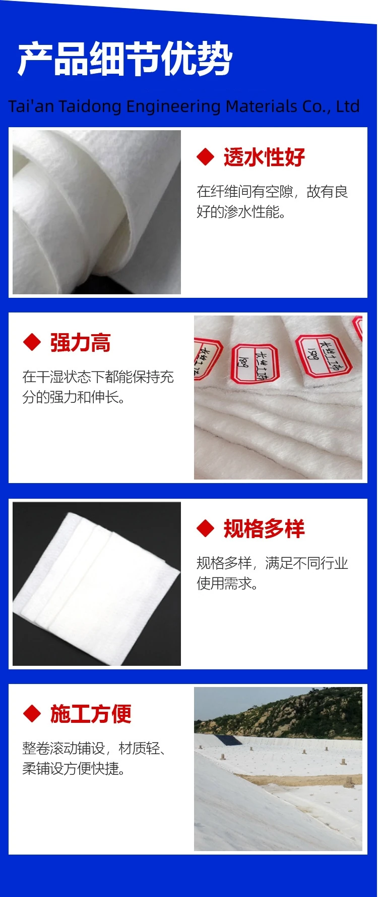 短絲土工布是以高強(qiáng)丙綸短纖維為主要原料,經(jīng)開松、梳理、雜亂、鋪網(wǎng)針刺以及噴灑拒水劑等工藝生產(chǎn)而成。